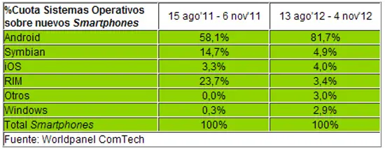 El sistema operativo Androidestá presente en el 81,7% de los nuevos smartphones renovados hasta noviembre, por lo que mantiene el liderato en el mercado español. Es una de las conclusiones principales extraídas del último informe sobre hábitos de compra, posesión, gasto y uso de telefonía móvil en España, realizado por la consultora Kantar Worldpanel entre el 13 de agosto y el 4 de noviembre de 2012.