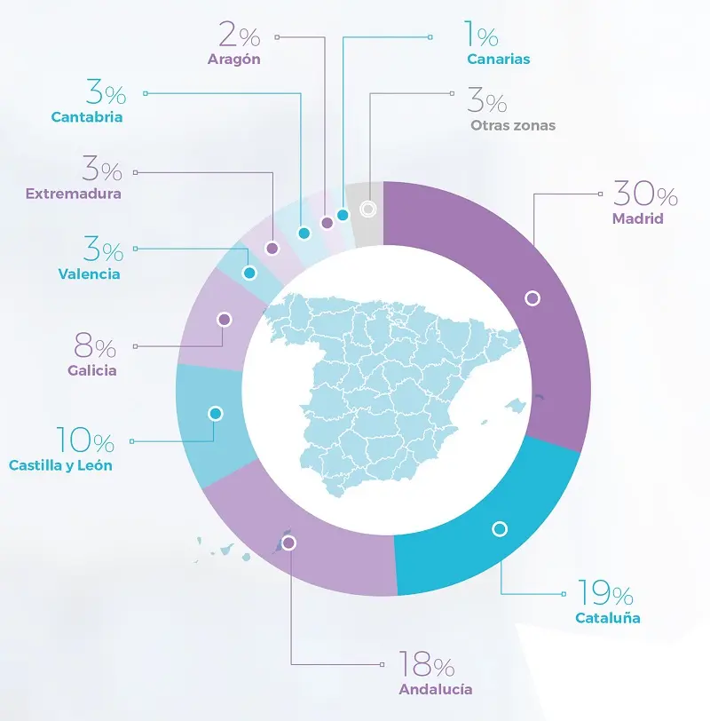 En España, Madrid, Cataluña y Andalucía siguen concentrando el mayor número de empleados (67%), aunque han reducido su peso porcentual en dos puntos respecto a 2020. Cataluña ha recuperado la segunda posición debido tanto a su incremento como a la caída de trabajadores en Andalucía.