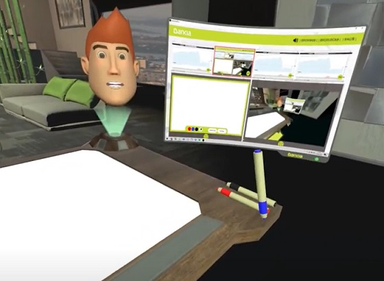 –Solución de videollamada con realidad virtual multidireccional en escenario inmersivo 3D, en la que el cliente utiliza unas gafas de realidad virtual para conectarse a un escenario Bankia en el que el asesor, que se muestra como un avatar, comparte diferentes pantallas de información sobre las que basa su asesoramiento y con las que el cliente puede interactuar, como si estuviera presencialmente reunido con el asesor en una oficina Bankia del futuro.