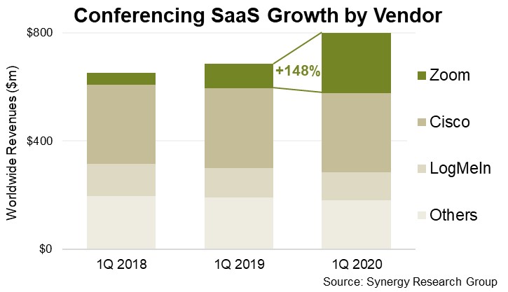 Según los datos de Synergy Research, el negocio de la conferencia SaaS creció un 17% en el primer trimestre del año, alcanzando los 800 millones de dólares. Y en este terreno dominó Zoom. Mientras que otros proveedores vieron sus ingresos estables o un pelín reducidos, Zoom creció un 148%. De acuerdo con la consultora, esto se debe a la estructura del mercado se divide en dos grandes segmentos. El más grande es el de la conferencia web/vídeo más tradicional, en la que Cisco, LogMeIn y Microsoft dirigen el cotarro. Los ingresos de esta industria fueron casi planos, disminuyendo un 1% respecto a 2019.
