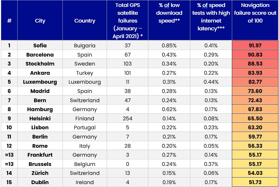 Con una puntuación de fallo de navegación de 91.97/100, Confused.com puede revelar que es más probable que los conductores experimenten pérdida de señal de GPS e Internet móvil lento en Sofía, Bulgaria. Con 37 casos de fallos en la señal de GPS en el primer trimestre de 2021, la capital también tuvo el porcentaje más alto (0,85 %) de velocidad de descarga lenta en toda Europa, lo que puede impedir que los conductores accedan a mapas digitales e información de tráfico cuando están en la carretera. Solo un 0,03 % por detrás de Luxemburgo (0,44 %) en el primer puesto, se descubrió que Sofía tiene el segundo porcentaje más alto (0,41 %) de pruebas con una latencia de Internet superior a 200 ms (milisegundos), lo que puede resultar en una respuesta lenta y, en consecuencia, en un retraso de la navegación.