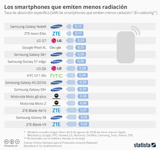 Según nuevos datos publicados por la Oficina Alemana para la Protección contra la Radiación (Bundesamt für Strahlenschutz), los modelos de smartphone que emiten menos radiación de entre los que se encuentran a la venta son el Samsung Galaxy Note 8 y el Axon Elite de la marca china ZTE, con una tasa de absorción específica (SAR) de 0,17 vatios por kilogramo en ambos casos. A estos les sigue el LG G7 y el Google Pixel XL, con un índice SAR de 0,25 y 0,26 vatios por kilogramo.