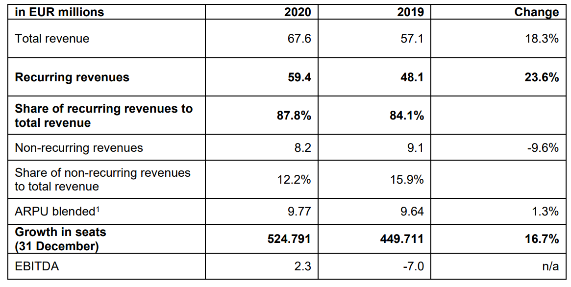 NFONacaba de hacer públicos sus resultados preliminares correspondientes a 2020. La compañía ha anunciado un aumento significativo en los ingresos recurrentes -que suponen cerca del 88% de los ingresos totales- en un 23,6% hasta llegar a los 59,4 millones de euros. Asimismo, los ingresos totales crecieron un 18,4% hasta los 67,6 millones de euros.