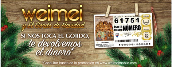 Weimei, la compañía española de telefonía móvil con una relación calidad/precio imbatible, compartirá la ilusión de la Lotería de Navidad con todos sus clientes mediante una promoción: el smartphone le saldrá gratis a todos los clientes que compren un terminal entre el 1 y el 21 de diciembre, si el número que juega Weimei es agraciado con el Gordo de la Lotería.