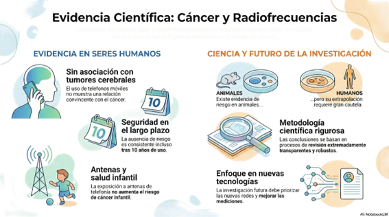 Basándose en dos revisiones sistemáticas exhaustivas de estudios observacionales en humanos (Karipidis et al., 2024 y 2025), el informe concluye que la evidencia actual no respalda una asociación causal entre la exposición a campos electromagnéticos de radiofrecuencias (CEM-R) y el cáncer.