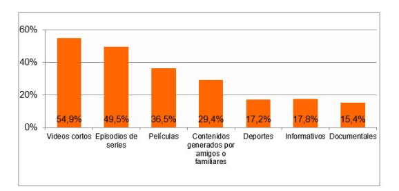Cada vez hay más individuos que consumen contenidos audiovisuales a través de Internet (en general, ya sea de manera abierta o de pago). Casi la mitad de españoles (48,3%) consumieron contenidos online al menos una vez a la semana. En este sentido los videos cortos son los contenidos más habituales (55%).