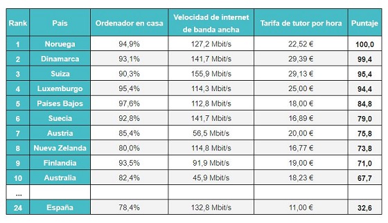 Noruega, el primer país en el ranking, ofrece las mejores condiciones para que la educación en línea se desarrolle a plenitud. La velocidad de Internet de banda ancha en el país nórdico es de 127,2 Mbit/s, mientras que en España es de 132,8 Mbit/s. De hecho, nuestro país es el sexto con Internet de banda ancha más veloz, sin embargo, la falta de herramientas tecnológicas obstaculiza el desarrollo del e-learning.