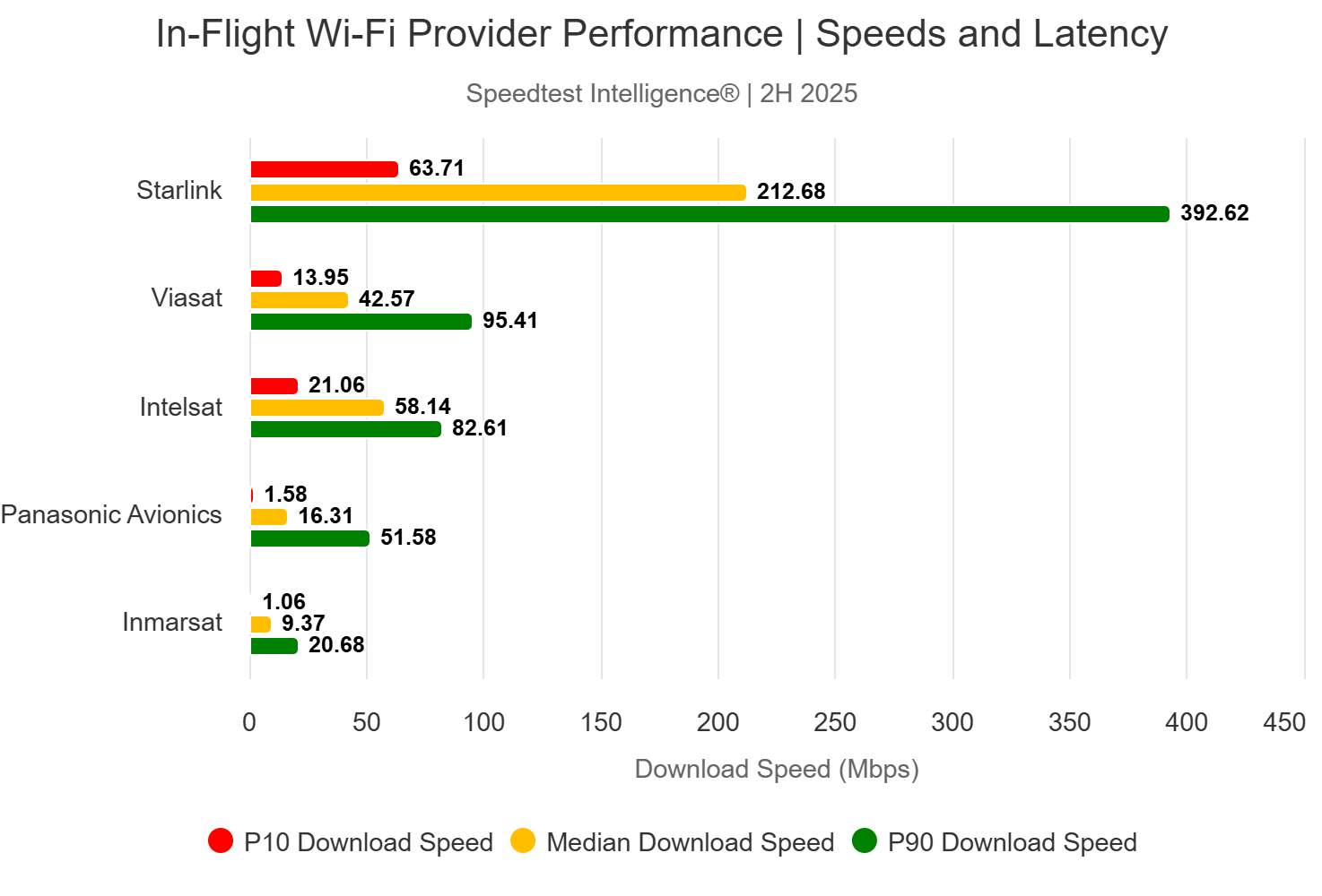 Por su parte, las velocidades medias de descarga de SITA (una solución tierra-aire que solo se encuentra en Qatar Airways en los datos de Speedtest), Inmarsat, Panasonic Avionics y Deutsche Telekom (también una red terrestre-aire) tuvieron un rendimiento pobre según esta medida.