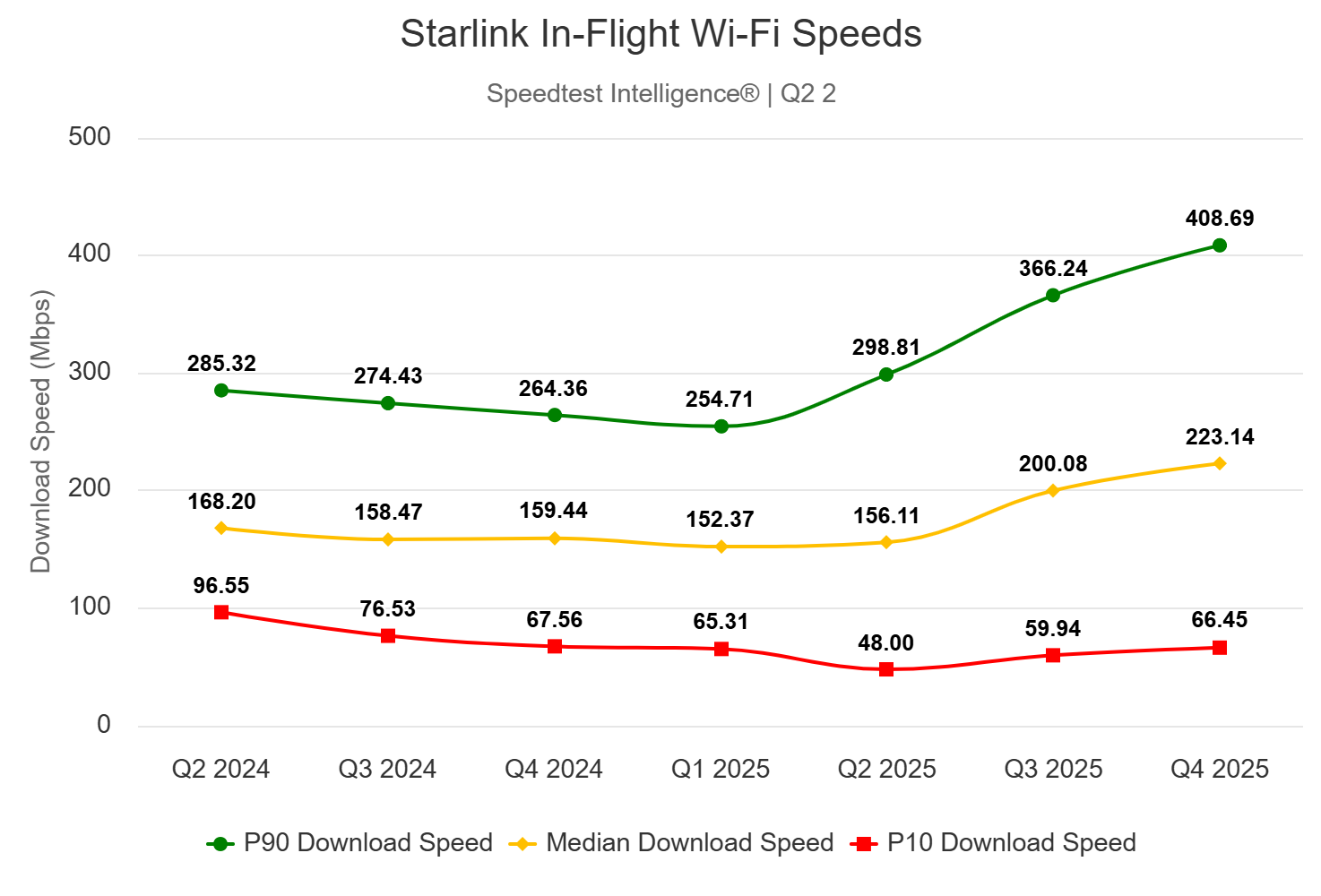 Recordemos que la constelación de satélites desarrollada por SpaceX comenzó a ofrecer Wi-Fi comercial a bordo cuando Hawaiian Airlines lo desplegó por primera vez en febrero de 2024. En dos años, capturó casi la mitad de la cuota de la muestra de pasajeros de aerolíneas comerciales en Speedtest (47,8%) para el cuarto trimestre de 2025. Sin embargo, no sólo está ganando participación, su mayor disponibilidad le ha permitido liderar en acciones al aumentar el número total de muestras de Speedtest.