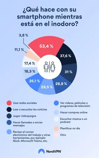 Una encuesta reciente elaborada por la empresa de ciberseguridad NordVPNha revelado que hasta un 80% de los españoles llevan el móvil al baño. Estas cifras están por encima del promedio de la totalidad de países encuestados. Mientras que la mayoría de los españoles (65%) revisa sus redes sociales en el baño, casi nadie se preocupa por las crecientes amenazas online y los intentos de los hackers de comprometer los teléfonos de la gente.