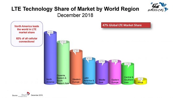 La participación de mercado de América del Norte en LTE fue un 82% y superó a todas las demás regiones del mundo en el cuarto trimestre de 2018; las siguientes regiones con el número de conexiones de este tipo más altas fueron Oceanía; Asia oriental y sudoriental con un porcentaje del 67%, seguida de Europa occidental con el 52%. América Latina y el Caribe tuvieron un crecimiento significativo de la cuota de mercado alcanzando el 40%, frente al 29% registrado a fines de 2017. La cuota de mercado representa el porcentaje de conexiones inalámbricas móviles que son LTE en comparación con todas las demás tecnologías de telefonía móvil.