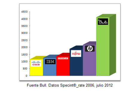 De acuerdo al benchmark SPECint_rate2006, el ordenador de Bull tiene el doble de velocidad sobre una configuración de 16 sockets.