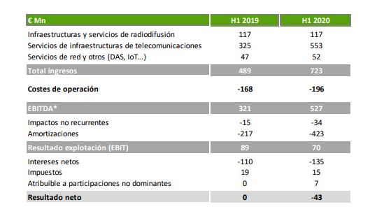 -En el primer semestre de 2020 los Servicios de Infraestructuras para operadores de Telecomunicaciones móviles aportaron a los ingresos totales el 77%, con 553 millones de euros, lo que supone un crecimiento del 70% respecto a junio de 2019.