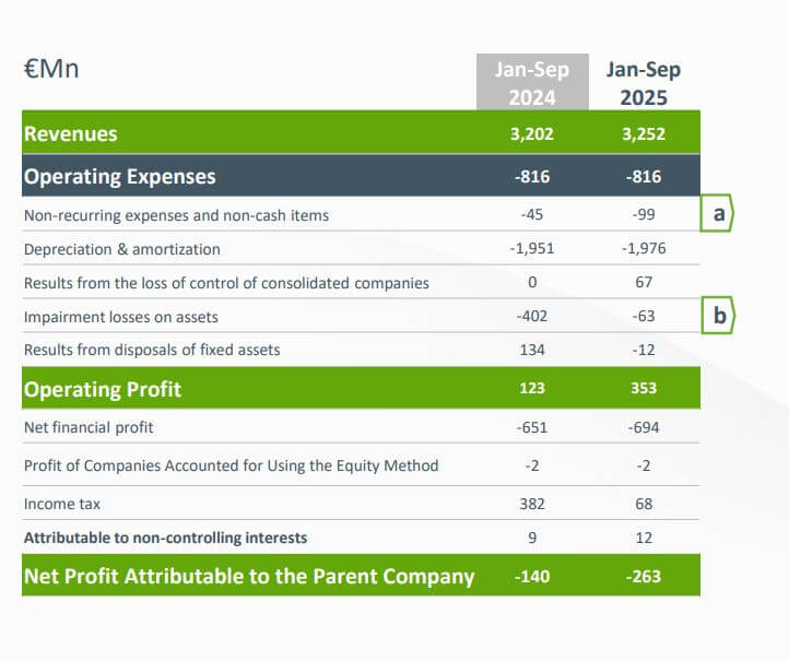 Cellnex acaba de hacer públicos los resultados financieros correspondientes a los primeros nueve meses de 2025. Así, durante este periodo la compañía registró unos ingresos de 2.937 millones de euros, lo que supone un crecimiento orgánico proforma del 5,7% (excluyendo Irlanda y Austria). El ebitda ajustado aumentó hasta 2.436 millones de euros (+6,9%), mientras que el ebitdaal alcanzó 1.787 millones de euros (+7,5%). No obstante, la compañía registró unas pérdidas de 263 millones de euros.