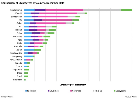 Sobre estos factores, el informe concluye que Corea del Sur, como lo hizo en la era 4G, se ha establecido como el líder del mercado para el despliegue de tecnología 5G con 4,67 millones de suscriptores a finales de diciembre, lo que equivale a alrededor del siete por ciento de los servicios inalámbricos en el mercado.