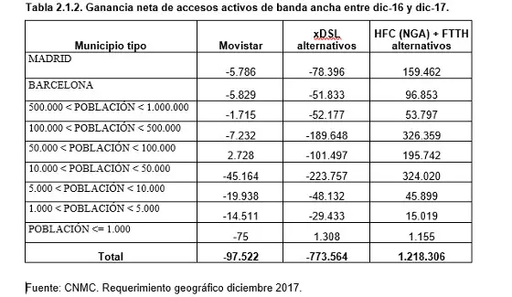 La presión competitiva de los operadores alternativos se tradujo en un incremento de su cuota en la mayoría de los municipios. Si bien Movistar se mantuvo como el operador con el mayor número de accesos activos FTTH (con algo más de un 24% del total), en las poblaciones con un tamaño superior a los 100.000 habitantes (excepto Madrid y Barcelona), la cuota de los accesos de fibra óptica de los operadores alternativos superó a la de Movistar: