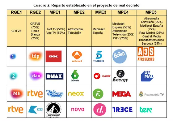 Partiendo de la oferta actual de canales de los operadores de ámbito nacional, los múltiples podrían quedar así tras la mudanza (naturalmente la oferta podrá variar en función de los planes de los difusores, especialmente CRTVE que obtendrá capacidad adicional, y según evolucionen los acuerdos actuales entre difusores):