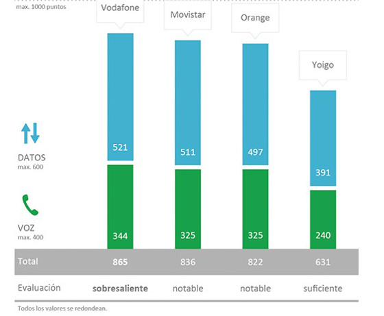 En tanto que ganador absoluto, Vodafone alcanza la calificación de “muy bueno” gracias a su excelente rendimiento en voz y datos. Su mejora en la categoría de datos es incluso más espectacular que en la de la ya sólida disciplina de voz. Le sigue Movistar con un pujante segundo lugar, que ha sido capaz de mejorar claramente sus resultados de 2015. Orange, en el tercer puesto, logra alcanzar la misma puntuación de voz que su constante rival, Movistar. Ambas redes merecen plenamente la calificación general de “buenas”. Yoigo ocupa la última posición, a una clara distancia de los otros tres. Sin embargo, la operadora más pequeña ha mejorado en la categoría de voz, aunque se ha estancado en la sección de datos.