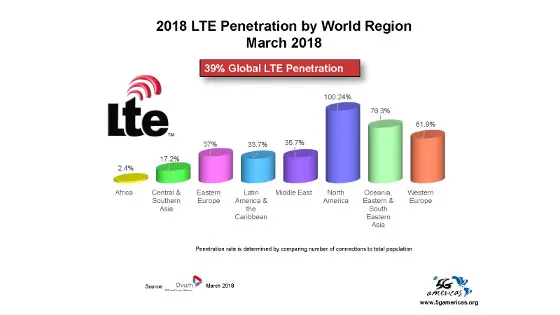 LTE alcanzó 365 millones de conexiones y una tasa de penetración superior al 100% en marzo de 2018, comparada con la población de 364 millones en Estados Unidos y Canadá. No se predice que ninguna otra región del mundo alcance el cien por ciende penetración para LTE con anterioridad al cierre de 2019. Se proyecta que esta tasa de penetración aumentará al 131% en 2021, tras lo cual las nuevas conexiones 5G comenzarán a impactar las suscripciones LTE y sus tasas de penetración. Al término de marzo de 2018, las siguientes regiones del mundo eran: Oceanía, Asia Oriental y Sureste Asiático, con el 76%; Europa Occidental con el 62%; a la saga se encontraban Europa Oriental con el 37%, Oriente Medio con el 36%y América Latina y el Caribe con el 34%.