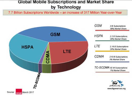 Mundialmente, se proyecta que LTE continuará su ímpetu para alcanzar cerca de 2.500 millones de conexiones a fin de 2017, 3.000 millones en 2018 y 4.200 millones en 2020. Se prevé que la 5G acumulará una cantidad perceptible de conexiones a partir de 2020 y, para 2021, se proyecta que tendrá 25 millones de conexiones en todo el mundo.