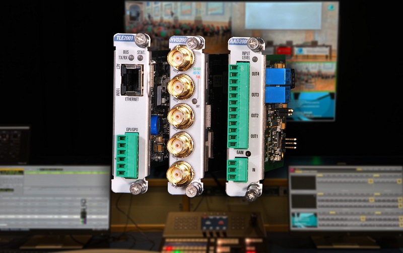 -El distribuidor de vídeo digital en formato SDI, modelo HVD2000C01, que cuenta con una entrada y cuatro salidas por las que se puede distribuir vídeo digital de cualquiera de los estándares habituales en entornos de producción de televisión: definición estándar de 270 Mbit/s, alta definición de 1,5 Gbit/s y alta definición de 3 Gbit/s.