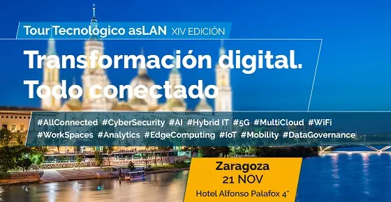 La Asociación @asLAN celebra una nueva edición del Tour Tecnológico y llega a Zaragoza el 21 de noviembre. Esta iniciativa, que forma parte del Plan de Actividades de la Asociación @asLAN para 2019, dirigido a crear espacios de encuentro y divulgación tecnológica conectados con ASLAN2020, está respaldada a nivel nacional por el COIT así como por destacados proveedores del sector como Nutanix, Sophos, Fortinet, Dell Technologies, Huawei, Cambium Networks, Allied Telesis, Team Viewer, NFON, Wavecom , Gigaset, Allot, CrayonyEconocom. Este año a nivel local, cuenta con el Colegio Oficial de Ingenieros de Telecomunicación de Aragón y Cluster IDiA como Entidades Colaboradoras