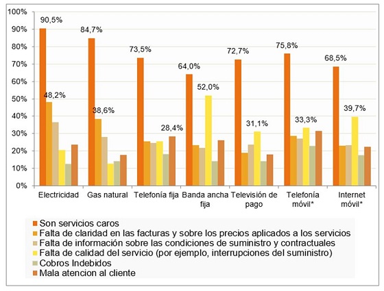 Para ser más específicos y como se ha observado en otras oleadas del Panel, el principal motivo de insatisfacción de los hogares es el nivel de precios. Así el 90,5% de los usuarios del servicio eléctrico manifiesta que el servicio es caro y el 84,79% opina lo mismo sobre el gas natural. Para estos servicios, el segundo motivo de descontento sería la falta de claridad en las facturas y sobre los precios.