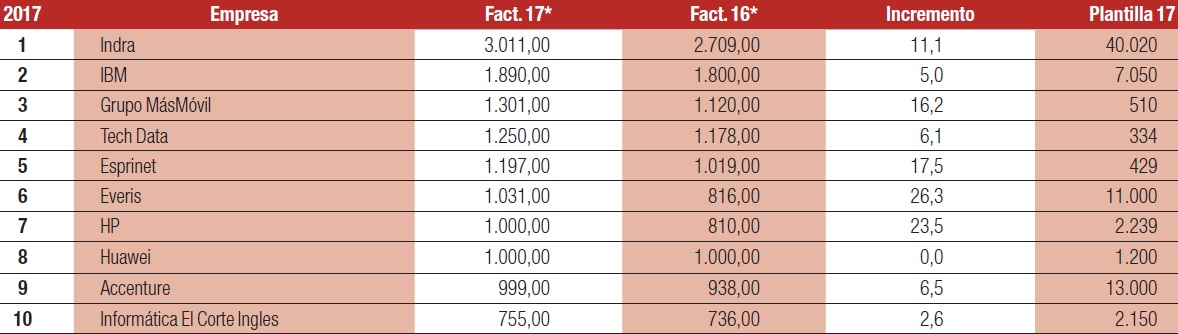 Indra continúa liderando el mercado, en esta ocasión superando por vez primera los 3.000 millones de euros, sobre todo después de la compra de Tecnocom y tras mejorar sus ingresos por encima del 11%. Everis e Iecisa son dos firmas nacionales que siguen manteniendo un puesto de honor en este Ranking. Y para completar este Top Ten, hay que mencionar a IBM, HPy Accenture, referentes ya clásicos que han experimentado un ritmo al alza, sobre todo HP con un aumento de su negocio por encima del 20%.