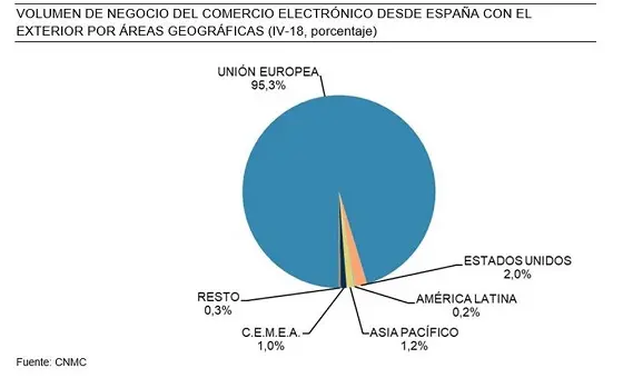 Concretamente, el volumen de negocio de las transacciones con origen en España y dirigidas hacia el exterior ha sido de 5.491 millones de euros, un 29,3% más que en el cuarto trimestre del año anterior. El 95,3% de las compras desde España hacia el exterior se dirigen a la Unión Europea.