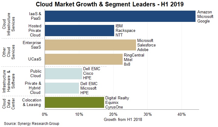 En la primera mitad de 2019, el gasto total en hardware y software utilizado para construir infraestructura en la nube fue de casi 55.000 millones de dólares, dividido de manera uniforme entre las nubes públicas y privadas. Las inversiones en infraestructura de los proveedores de servicios cloud ayudó a generar más de 90.000 millones de dólares en ingresos. Tales proveedores necesitan un lugar para albergar su infraestructura, por lo que el gasto en servicios de arrendamiento y colocación de centros de datos continúa creciendo fuertemente. Mientras tanto, UCaaS, aunque en muchos sentidos es un tipo diferente de mercado, también está creciendo fuertemente y está impulsando algunos cambios radicales en las comunicaciones comerciales.
