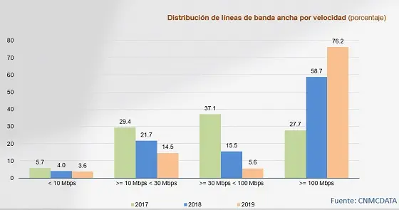 Esta mejora se reflejó en un aumento de las velocidades de las líneas de banda ancha contratadas. Casi el 82% de las líneas tuvieron una velocidad igual o superior a los 30 Mbps, frente al 74% del año anterior. El porcentaje de las líneas con velocidad de 100 Mbps o superior alcanzó el 76% frente al 59% del año 2018.