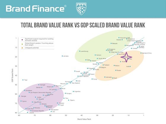 Como España, las naciones BRIC (Brasil, Rusia, India y China) grandes y de rápido crecimiento caen por debajo de la línea (Gráfico 1), lo que sugiere que su rango en el valor de la marca global en relación con el tamaño de sus economías deja un potencial significativo para el crecimiento de las marcas locales. Las economías que están por encima de la línea de tendencia son las más exitosas en el desarrollo de marcas en proporción a su tamaño.