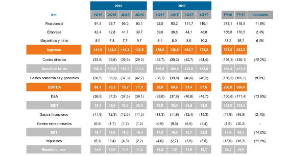 A pesar del exigente entorno competitivo, los ingresos del segmento residencial se incrementan un 11,6% con respecto a 2016. En el segmento empresa crecen un 2,4%, mostrando un cambio de tendencia con una evolución positiva al final del último trimestre del año. Los tres últimos meses del ejercicio han registrado los mejores resultados en ingresos y se ha alcanzado récord de penetración en todos los productos, como consecuencia de las medidas implementadas durante el año. Una tendencia que se mantiene durante los primeros meses de 2018.