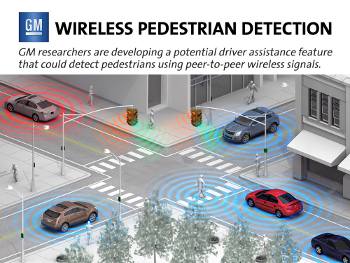 La detección inalámbrica de peatones forma parte del constante desarrollo de GM de sistemas de comunicación: vehículo-infraestructura (V2I) y vehículo-vehículo (V2V), que podrían proporcionar un aviso anticipado de peligros, como vehículos lentos o parados, carreteras resbaladizas o intersecciones y señales de Stop.
