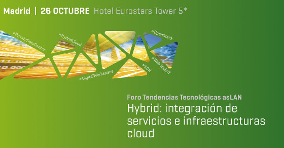 El próximo jueves 26 de octubre en el Hotel Eurostars Tower Madrid tendrá lugar el Foro Tendencias Tecnológicas «Hybrid: integración de servicios e infraestructuras cloud», enmarcado en un conjunto de eventos organizados por la Asociación @asLAN para 2017 en los que se planteará como la confianza, la inteligencia de negocio y la flexibilidad, son tres ámbitos en los que los servicios e infraestructuras digitales pueden aportar una ventaja competitiva.