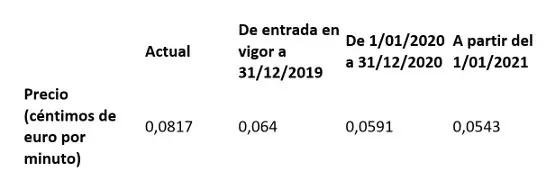 2. Actualizar el precio de terminación fijo, de 0,0817 céntimos de euro por minuto a un precio situado en 0,0640 céntimos de euro por minuto para 2019, 0,0591 céntimos de euro por minuto para 2020 y 0,0543 céntimos de euro por minuto para 2021.