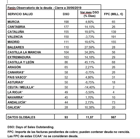Hay Comunidades Autónomas que han reducido sus días de pago en el último año, es decir, desde junio de 2018 a junio de 2019, como Extremadura, al pasar de 178 días a 103 días, (75 días menos); Baleares de 126 a 110 (16 días menos), Canarias de 70 a 58 (12 días menos), Asturias de 59 a 50 (9 días menos), Navarra de 52 a 45 días (7 días menos), Aragón de 71 a 65 (6 días menos), La Rioja, de 52 a 49 (3 días menos), que mejoran la deuda que tienen los Gobiernos regionales con el sector de Tecnología Sanitaria, en comparación con el cierre a 2018.