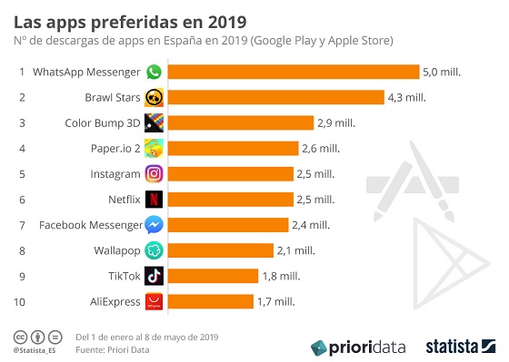 De las cinco aplicaciones más populares en España en lo que llevamos de 2019, tres son videojuegos. Así, tras el servicio de mensajería WhatsAppque, como es habitual, lidera el ranking con cinco millones de descargas, aparecen solo juegos digitales. El primero de ellos, Brawl Stars, es una plataforma multijugador de peleas de los creadores de Clash Royal y Clash of Clans que fue lanzado a finales del año pasado. Este ha sido descargado nada menos que 4,3 millones de veces. Le sigue con 2,9 millones de descargas la app del mismo género Color Bump 3D, en el que se arrastra una bola a través de distintas plataformas tratando de evitar las piezas de color.