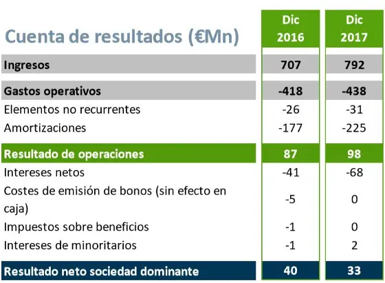 Cellnex Telecom ha presentado los resultados correspondientes al cierre del ejercicio 2017. Los ingresos ascendieron a 792 millones de euros y el ebitda alcanzó los 355 millones. El resultado neto cerró en los 33 millones de euros, recogiendo el efecto de las mayores amortizaciones (+27%) y costes financieros (+68% vs. 2016) asociados al intenso crecimiento del grupo y la consiguiente ampliación del perímetro.