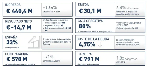 La contratación también experimentó un gran impulso, aumentando un 91% en comparación con el ejercicio 2017, hasta 578 millones de euros. La cartera de la empresa alcanza a diciembre de 2018 791 millones de euros, y está basada en contratos plurianuales con los operadores de referencia en los sectores de telecomunicaciones y energía.