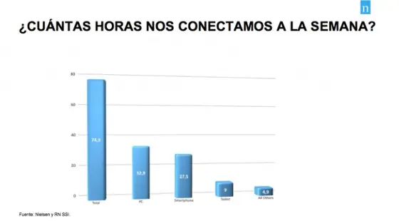 De acuerdo con este estudio, si una semana tiene 168 horas, el 44% del tiempo (unas 74 horas) las pasamos conectados a Internet. 9 de cada 10 se conectan a diario con el móvil y un 74% con el portátil. El smartphone se impone, de nuevo, como dispositivo rey. Otro dato curioso: pasamos más de 10 horas de media en online, frente a 7 de sueño. En total, tres cuartas partes de la semana estamos haciendo clic o estamos “off”.
