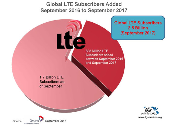 5G Americas ha anunciado que el número de conexiones LTE en el mundo ha alcanzado los 2.500 millones a finales de tercer trimestre de 2017. Esto supone un incremento de 838 millones de nuevas suscripciones LTE en un año, de acuerdo con Ovum. La cuota de mercado de esta tecnología ascendió al 32% en este periodo, lo que implica un aumento de casi 10 puntos porcentuales.
