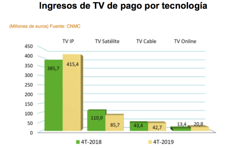 Analizando los ingresos en función de los diferentes medios de transmisión o tecnología de la TV de pago, la evolución se mantuvo prácticamente igual que en periodos anteriores: la TV IP (televisión transmitida por las redes xDSL o FTTH a través de un ancho reservado) y la TV online (televisión de pago Over The Top a la que se accede con usuario y contraseña) crecieron, mientras que la TV por satélite y la TV por cable retrocedieron.