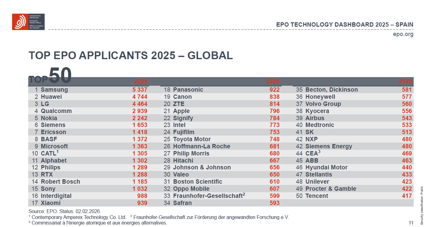 Otro análisis que se extrae de esta clasificación global ampliada hasta el top 50 es la amplitud sectorial de la innovación que llega a Europa: junto a grupos tecnológicos y de telecomunicaciones aparecen compañías industriales, farmacéuticas, automovilísticas y de bienes de consumo como Philips, Robert Bosch, Sony, Panasonic, Canon, Apple, Toyota, Johnson & Johnson, Airbus, Medtronic o Hyundai Motor. Una diversidad que, como señalan desde la OEP, confirma que la patente europea sigue siendo un indicador clave no sólo de innovación digital, sino también de la transformación tecnológica de industrias tradicionales.