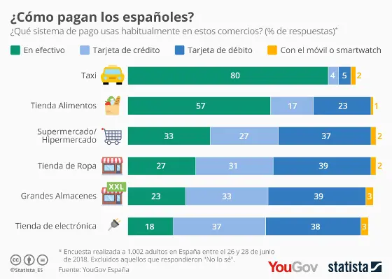De forma general, y a la vista de este gráfico de Statista, no hay duda de que el modo de pago más común depende del tipo de negocio que se trate. Por ejemplo, las tarjetas de crédito y débito son los métodos más habituales en las tiendas de electrónica (un 75% de respuestas en el citado sondeo, entre las dos opciones), los grandes almacenes (72%), las tiendas de ropa (70%) y los supermercados e hipermercados (64%). En cambio, los trayectos en taxi son en su mayoría (80%) abonados en efectivo.