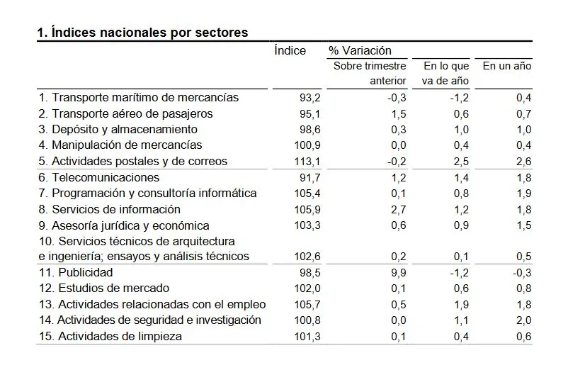 Asimismo, entre las actividades cuyos precios aumentaron en el segundo trimestre de 2019 respecto al trimestre anterior destacó, sobre todo, la publicidad, que elevó sus precios un 9,9%. Le siguieron los servicios de información (2,7%), el transporte aéreo de pasajeros (1,5%) y las telecomunicaciones (1,2%).