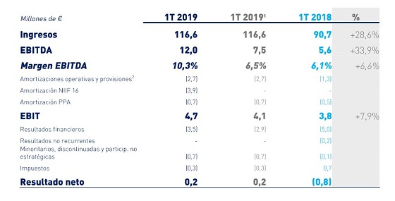 El tercer factor es la reducción de gastos financieros, concretamente un 2,1 millones. A finales de 2018, la compañía firmó un acuerdo de refinanciación cuyo efecto se ha reflejado en este primer trimestre. La deuda neta llega a los 106,9 millones, lo que implica una bajada de 1,1 millones.