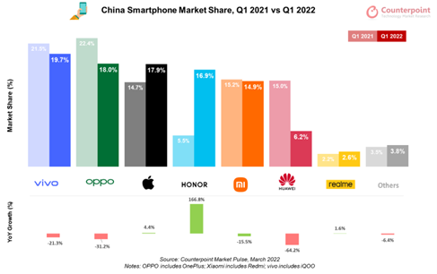 Según el informe mensual de pulso de mercado de Counterpoint Research, y teniendo en cuenta una tendencia a la baja en el mercado de teléfonos inteligentes de China, en el primer trimestre de 2022, vivo se situó en primer lugar con una cuota de mercado líder del 20%. La posición durante el trimestre fue impulsada por la retroalimentación positiva del mercado de su línea de productos, incluyendo la recién lanzada serie S, así como la serie Y.