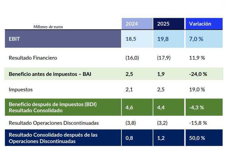 “Los resultados de 2025 están por encima de los objetivos anuales de rentabilidad comunicados por la compañía, alcanzando los 46,3 millones de euros de ebitda (el objetivo era de 41 millones), y con un margen ebitda del 16,4% (objetivo del 11,1%)”, indican en el comunicado.