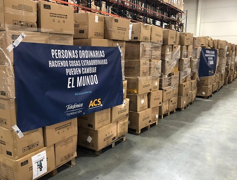 ACS yTelefónica, a través de Fundación Telefónica, han recibido en Madrid dos vuelos completos con equipos de protección individual para donar a hospitales de toda España, y esperan uno más que llegará mañana martes 26.